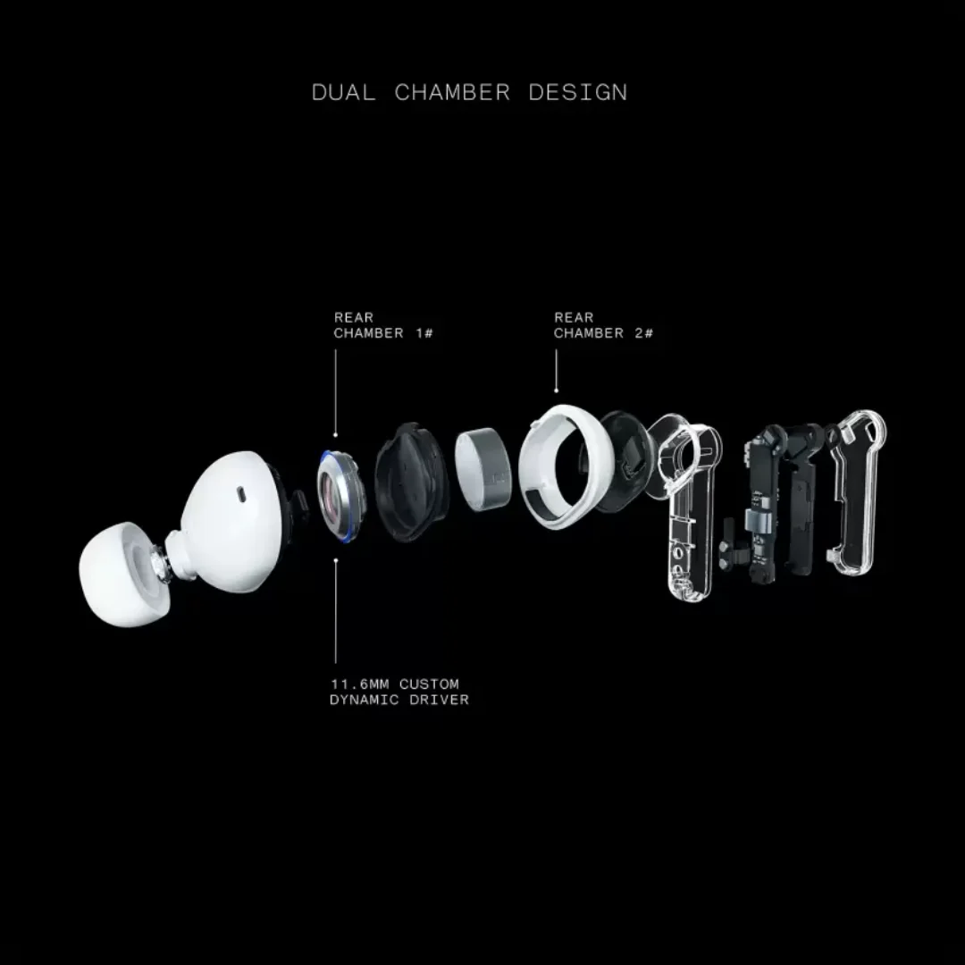 Dual chamber sound. Custom 11.6 mm driver. Hi-Res Audio Certified, compatible with LHDC 5.0 codec. Personal sound profile.
